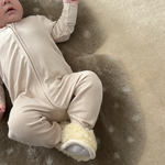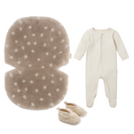 Give them the softest start with our forever faves the MORI Ecru Clever Zip Sleepsuit, MILK Binibooties & NEW! FAWN Snuggler®.