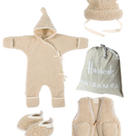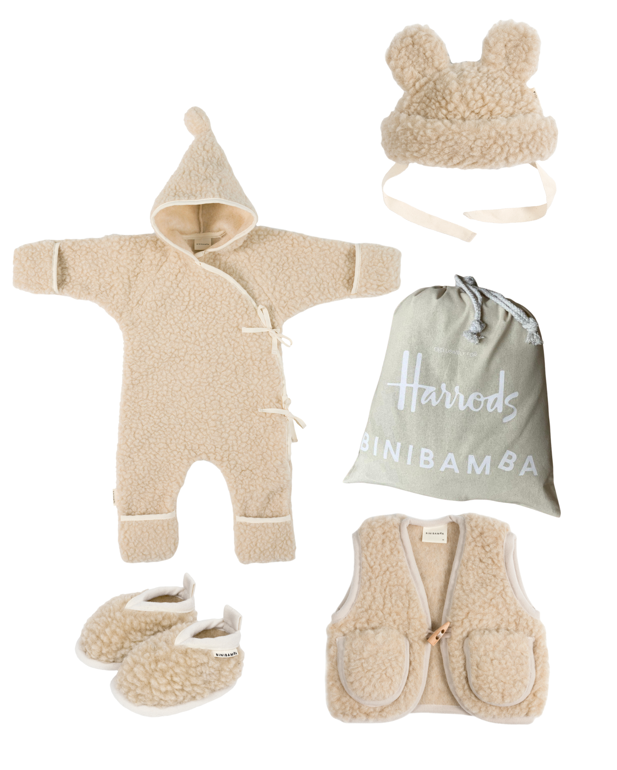 Treat your Binibabe to the BINI selection of dreams all in our Harrods exclusive shade of PEANUT. This luxury bundle includes all our faves from our signature Snugglesuit & Vest to our Teddy Hat & super soft merino Booties. More Peanuts please!