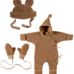 Keep them warm as toast from head to toe with our pure Merino wool Snugglesuit, Teddy Hat & Baby Mittens in our cosy teddy shade, BRUNO.