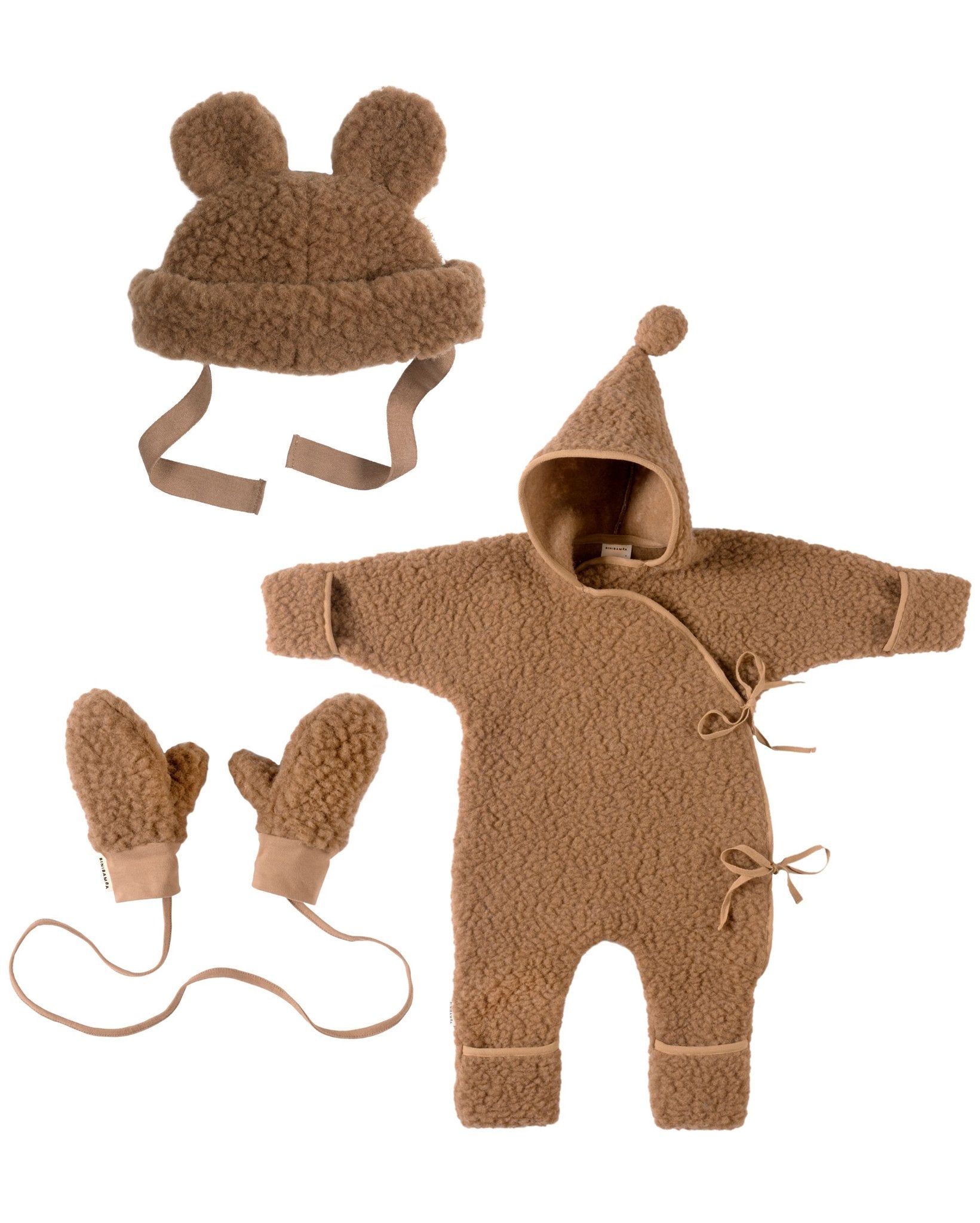 What to wear today? Bini has the answer. Our outlook is cosy, whatever the weather. Bundle includes our pure merino heroes the Snugglesuit, Teddy Hat & Baby Mittens in BRUNO.